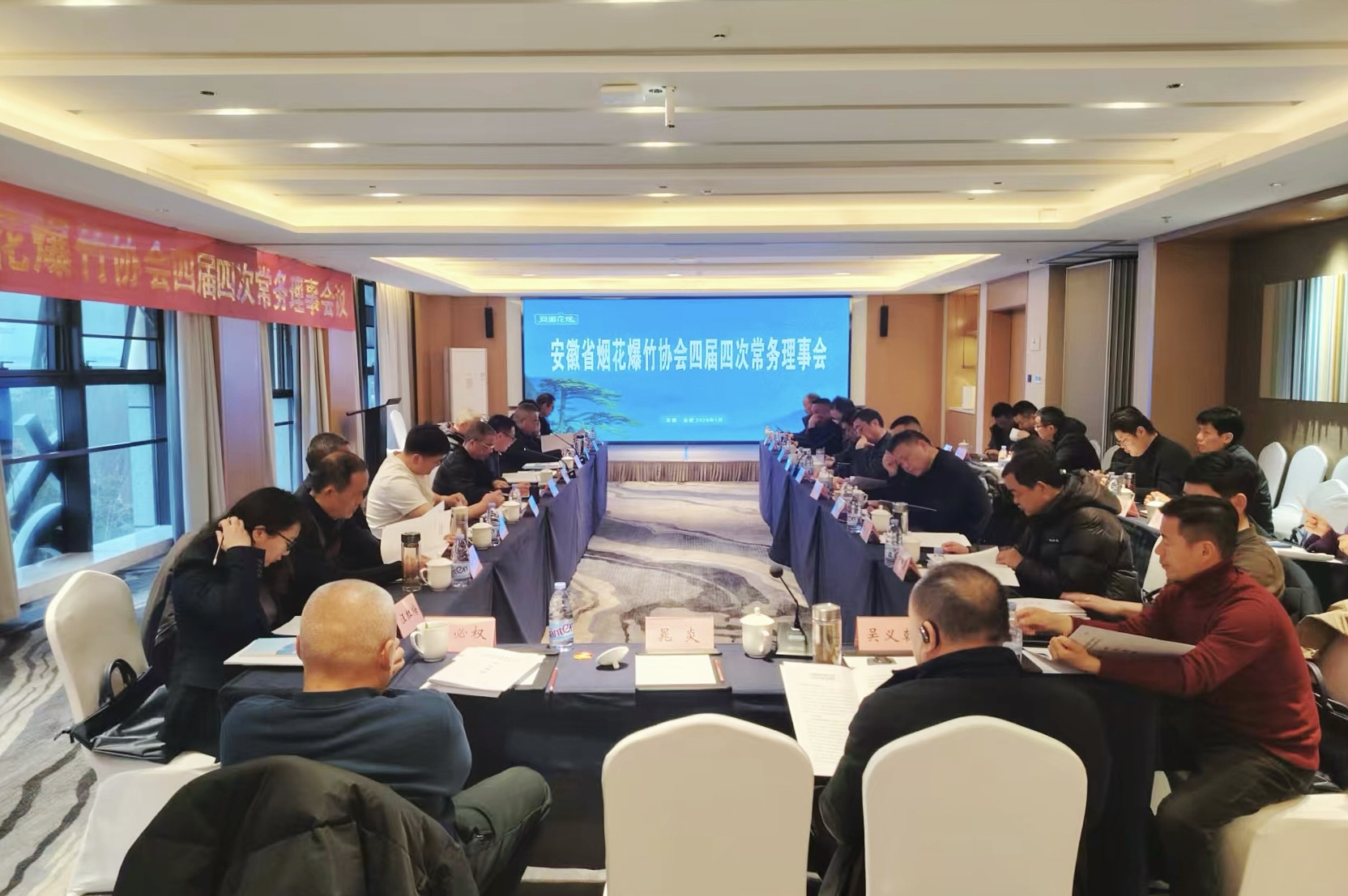 2026年1月26日至27日,安徽省烟花爆竹协会四届四次常务理事会议在合肥召开。会议由冯竹兵会长主持。副会长程永忠、朱永桂、杨承世、刘琦、崔齐、庞灏,秘书长汪红梅以及全体常务理事出席会议。监事谭子良、宛建华与 5 名特邀会员代表列席会议。