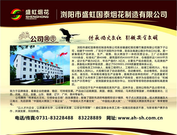 浏阳市盛虹国泰烟花制造有限公司系安徽盛虹集团投资股份有限公司全资子公司,创建于1999年,厂区位于浏阳市沙市镇,距岳汝高速公路出口3公里,是一家集烟花产品研发、生产、销售、焰火燃放于一体的国有控股企业。工厂占地面积1000余亩,标准化厂房419栋,建筑面积约46000平方米,仓储面积达13000平方米,设计生产能力2亿元,年总产值约1.3亿元,主要生产组合烟花类、礼花弹类产品,具备焰火燃放甲级资质,通过了ISO9001:2008质量管理体系认证。
